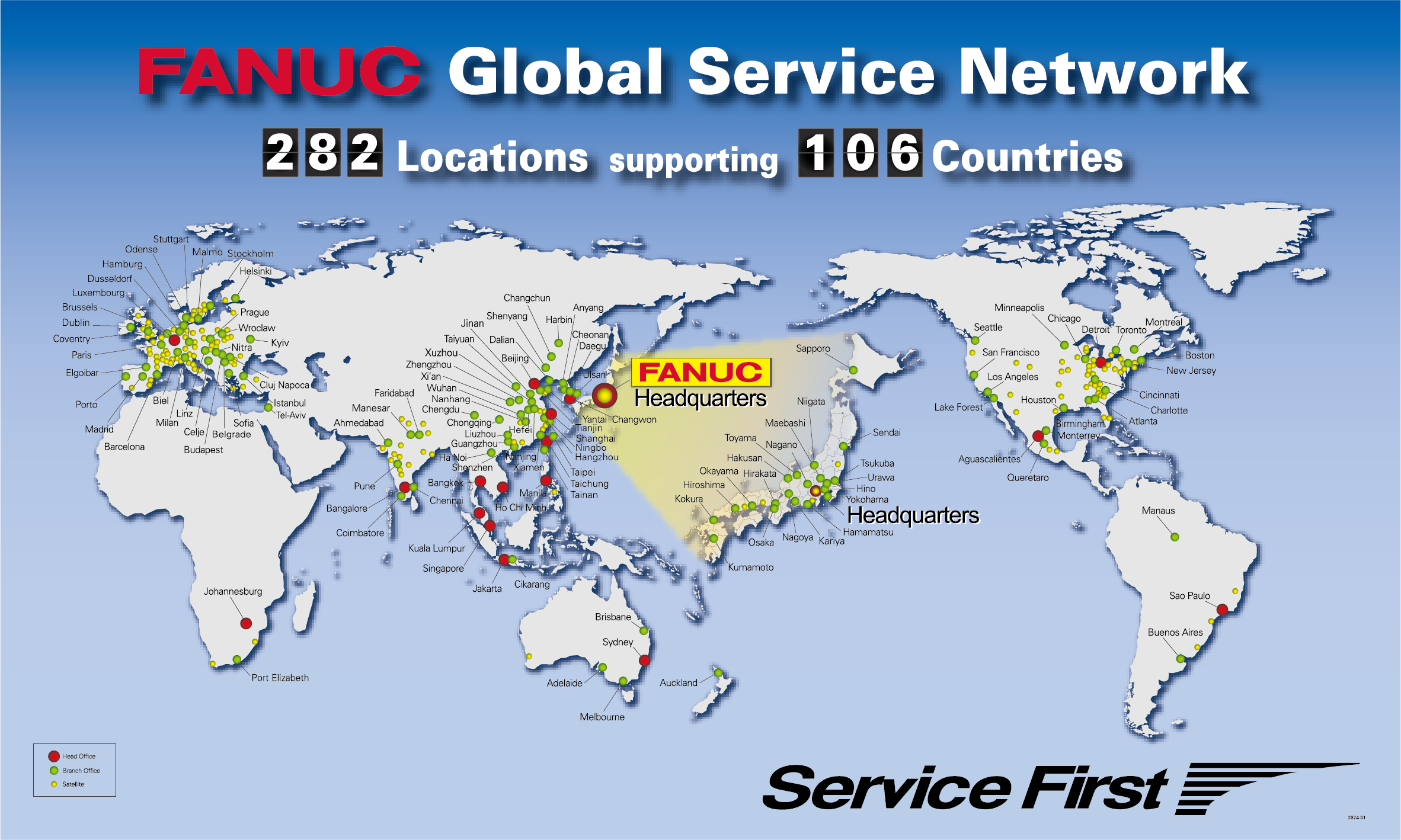 發那科公司在全世界建立了282個服務網點, 為106個國家和地區全力提供技術支持